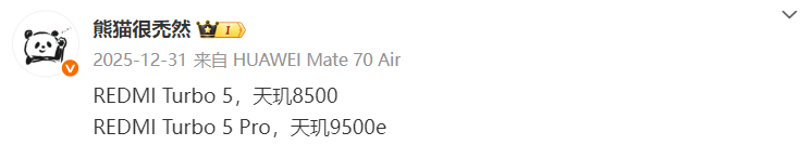 据悉,红米Turbo 5系列将分为两个版本,一款搭载天玑8500处理器,一款搭载天玑9500e处理器,定位标准版和Pro版。