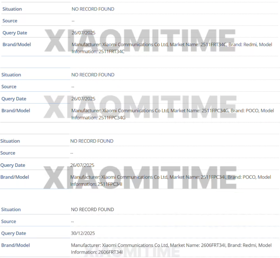 因为科技媒体XiaomiTime通过深挖GSMA IMEI,发现了旗下新机型的明确编码,其中2511FRT34C与2606FRT34I等型号赫然在列。