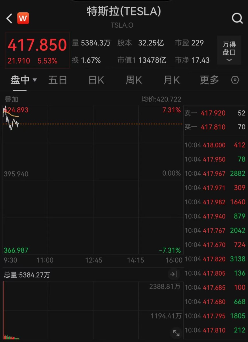 热门科技股方面,特斯拉股价高开,一度涨超7.3%。
